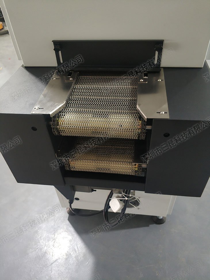 UV固化機采用韓國LG雙組LED光源,主波峰為365nm,搭配水冷散熱系統,確保長時間高效穩定運行。設備配備人機界面觸摸屏,支持手動調節燈組高度(50mm入口設計)及輸送速度(0-5m/min),適配不同生產需求。輸送系統采用不銹鋼穿軸網帶,雙通道設計(上層左→右,下層右→左),輸送寬度可微調至172mm,適用于電子封裝、光學鏡片、醫療檢測、三防漆涂覆等高精度場景。結合雙通道UV固化技術,可快速完成膠水、油墨、光油等材料的精準固化,兼具環保性與工業級可靠性。